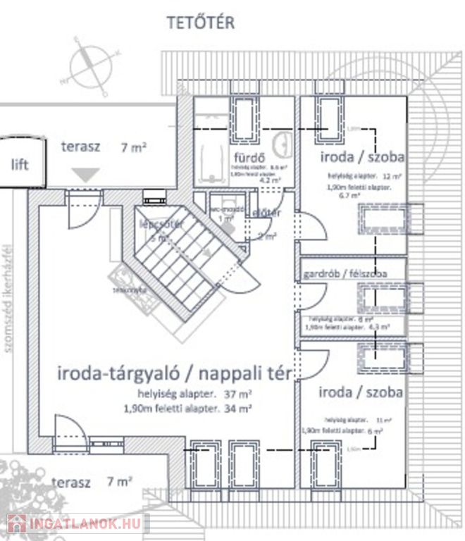 tetőtér (kb. 76nm 1,90m feletti kb. 60nm)