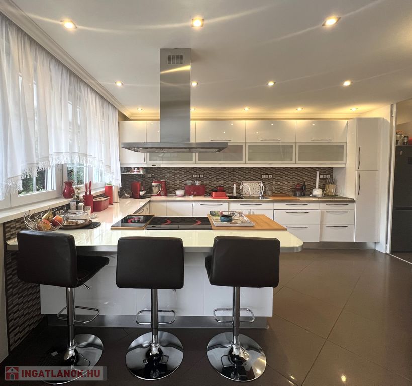 • az étkezőhöz kapcsolódó nagy üvegfelületekkel kerti teraszra néző, nagyméretű beépített konyhabútorral és konyhagépekkel felszerelt nagy konyha terület (15 nm), konyha szigettel nagyteljesítményű páraelszívóval, étkezőpulttal,