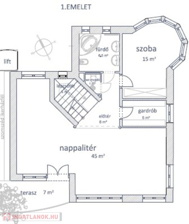• az előtérből nyíló a földszintihez hasonló íves üvegfelülettel megvilágított szoba (kb. 15nm), mellette jelenleg gardrób ablak megvilágítással,